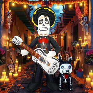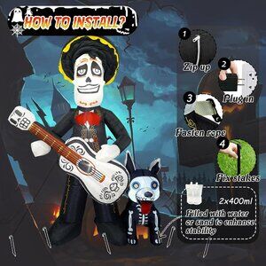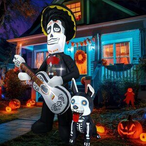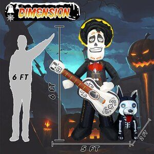 6 FT Sugar Skull Guitar and Skeleton Dog Blow Up Inflatables with Built-in LED