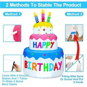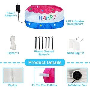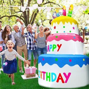 🧿[ 6Ft Tall Inflatables Happy Birthday Cake ] A unique design of lighted inflatables 3 layers Happy Birthday Cake with 3 colorful candles and "Happy Birthday" Letters. Come with a 6 Foot height inflatables, 6 plastic ground stakes, 2 sandbag, 1 tethers, 1 plug and a built-in blower. Copyright Certificated Model.Size:6*3.6Ft (H*W).