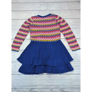 VGUC Hanna Andersson sweater dress. Colorful flower stripes on the bodice and sleeves. Dark blue tiered skirt. Light wash wear