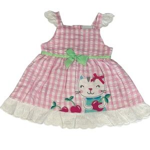 Adorable pink gingham dress. Features cute cat and cherry design. Green bow accent. Perfect for casual outings.