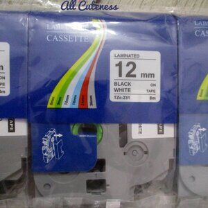 Pack of 6 Label Tape Cassette. Laminated 12mm. Black on white tape. TZc-231 8m.