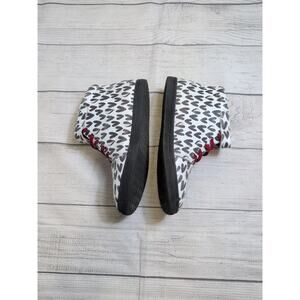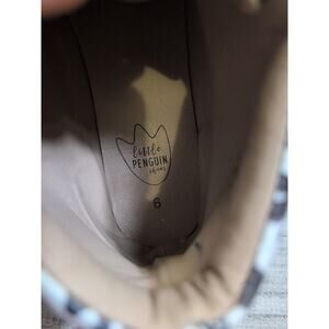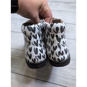 GUC Little Penguin boots. White with black heart print. Single hook and loop strap with elastic laces. Very good tread. In GUC for light cracking