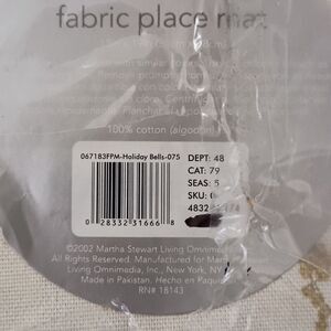 6 MARTHA STEWART Placements Bells Greenery Fabric Christmas Holiday Winter NEW. Condition is new in wrapper. Measures about 19" x 13". You get a set of 6. The plastic has a small opening on the bottom. Doesn't affect the placements at all. Please see all photos for detailed condition.
