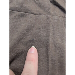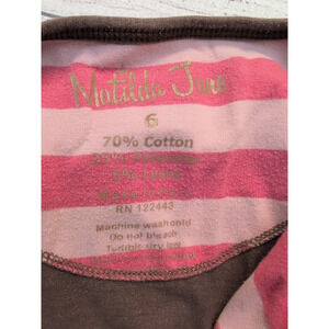 PLAY Matilda Jane wrap dress. Brown with pink stripes on part of the bodice. Deer on the front of the skirt and a mushroom on the back. Light wash wear/pilling, tiny hole under bodice
