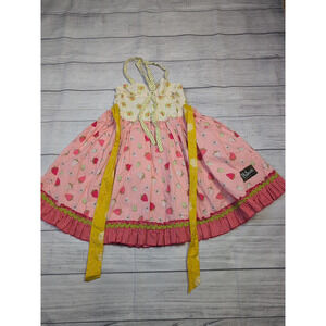 EUC Matilda Jane Platinum Ellie dress. Floral and polka dot bodice with strawberry print skirt. Red and white plaid ruffle hem. Striped straps that met at top of the smocked back. Minimal signs of wear