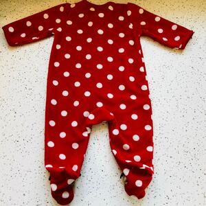 Cute red and white polka dot fleece footed pjs with reindeer. Cute Christmas pjs. Gently worn and has a little "piling" or little white balls of fleece that will not come off with a lint roller. See last 2 pics