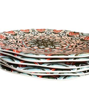 I love this 2019 retired abstract patten from Opalhouse! This set of 6 melamine dinner plates reminds me of something you'd find at Anthropologie. The colors in this pattern are vivid and all six plates are in fantastic condition. They are BPA-free and dishwasher safe but should not be placed in the microwave. They have a slightly ruffled or scalleoped edge that adds to their charm.