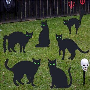 Package Included : This set comes with 6 pcs black cat Halloween decor yard signs, 6 pairs glowing eyes stickers and 12 sturdy black fiber stakes; These scary black cats will create creepy atmosphere at Halloween night