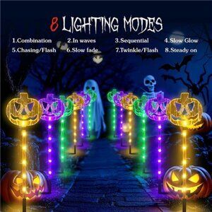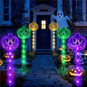 【Easy Set Up】Easy to use, simply insert into ground. Allowing you to fit them into the ground effortlessly. Lighted Pumpkin Pathway Lights are designed with Clear acrylic. These Lighted pumpkin are green,purple and orange, Glowing in The Dark, they are perfect Halloween Decorations Pumpkin Pathway lights for your patio pathway garden yard graves.