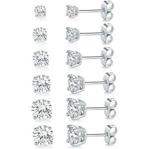 6 Pair CZ Stud Earrings Set 18K White Gold Plated Round Clear for Men Women