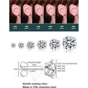 *SET OF 6 PAIRS - Package includes 6 pairs of stud earrings in 6 sizes, 3mm/4mm/5mm/6mm/7mm/8mm. Gauge Size: 20G =0.8mm, pin size: 10 mm. The butterfly buckle add extra protection for you.