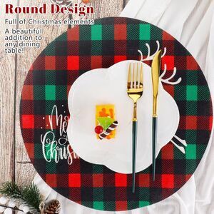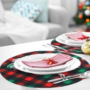 Package includes: you will receive six round checked Christmas placemats with a diameter of 13.3 inch which can meet your daily needs; These placemats are decorated with Christmas trees, deer, snowflakes, water cups, gloves, feathers and so on, to better match the atmosphere of Christmas, they can also be paired with many plates or cutlery, nice for everyday use, family meals and holiday gatherings, as well as restaurants and cafes providing colors for meals or gatherings