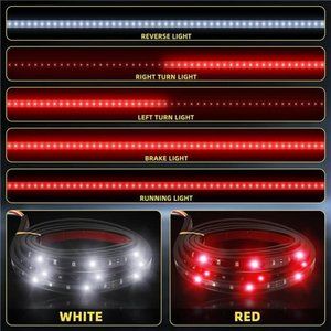 LED reverse light for trucks has a dustproof and waterproof rating of IP67, lightweight yet not bring some burden for you, and please do not knock, bump, or trample when using it. Specifications: Material: rubber Color: as pictures shown Size: about 60 inches/ 1.5 m long Package includes: 6 X 60 Inch tailgate bed light strip Notes: Manual measurement, please allow slight errors on size. The color may exist a slight difference due to different screen displays. Winding risk may exist, kids should use them under adults' supervision.
