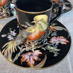 6 Pcs Fitz&Floyd Chinese Pheasant Plate& Mug 14K Trim Black Olive Green Blue. Made in JapanBlack base & multiful Vibrant colors 14K gold trimPlate  has 7.5" Diameter Salad or DessertMug 3.75" Tall 2.75" DiameterNo chips, cracks or crazing