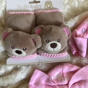 4 piece Gerber Preemie Preowned Baby Pink Love Sleeper Gown with Matching Bow Beanie Cap And Matching Sock Booties.New Kelly Baby 2 pack Baby Seat Belt Covers New In Original Package.Super adorable bundle set
