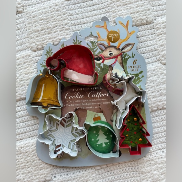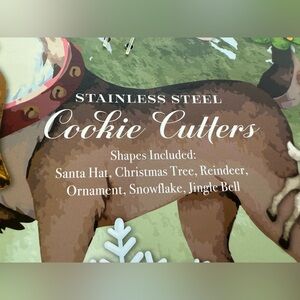 New. Adorable 6 piece set of Christmas theme cookie cutters. Stainless steel. Santa Hat, Christmas Tree, Reindeer, ornament, Snowflake and Jingle Bell. Smoke free home.