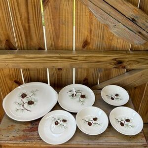 6 Pieces Pinecone Pattern by French Saxon China. This Discontinued Pattern Features Branches Of Pine Cones. Made in USA.