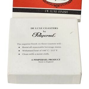 This is a set of 6 Pimpernel Spode Christmas Tree Coasters in their original box. They have a cork back. It is a signature set with Deluxe Finish. The superior finish on the coasters will resist all reasonable beverage stains, withstand heat of 100*C (212*F), and Clean with a moist cloth. It is an original Pimpernel product that was made in England. The box has some light wear (see photos). The coasters are in excellent condition. It also includes the original fold out paper that came in the box.