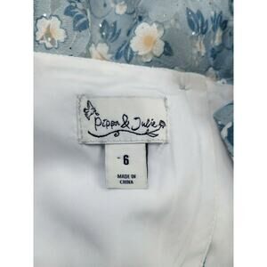 NWT Pippa & Julie Falyn ruffled floral dress. Light blue lace overlay with white floral print. Glitter throughout. Ruffled sleeves and hem. Fully lined. Three buttons on the back