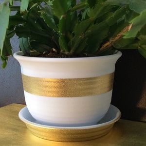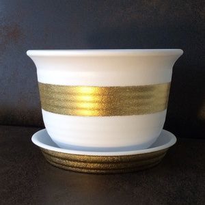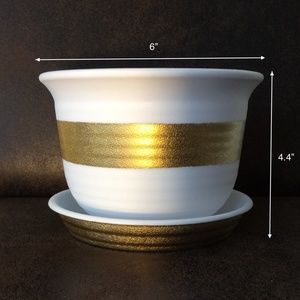 6” Plastic Round Drainage Plant Pot with Saucer Tray for Indoor and Outdoor Herbs, Succulents, Cactus and Flowers Premium Quality - Made of hard and thick plastic that is durable and last for a long time Perfect for Indoor / Outdoor - These flower plant pot will be your best decoration for a dining room, kitchen, porch, bathroom, and garden Plants NOT Include - These package doesn't come with any plants Color: White/Gold Material: Plastic Size: 6 inches x 4.4 inches Drainage Holes: Yes