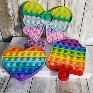 Unleash a world of tactile fun with this vibrant collection of rainbow-colored Pop It fidget toys! This playful set includes a delightful array of shapes – a whimsical butterfly, a sweet heart, a classic circle, and a quirky square reminiscent of an ice cream treat. Each toy is designed to provide endless hours of satisfying popping sensations, perfect for stress relief, focus enhancement, or simply engaging restless fingers. The rainbow gradient across each shape adds a touch of visual delight, making them as pleasing to the eyes as they are to the touch. Ideal for quiet moments at home, keeping busy during long car rides, or adding a pop of color to your desk at the office.