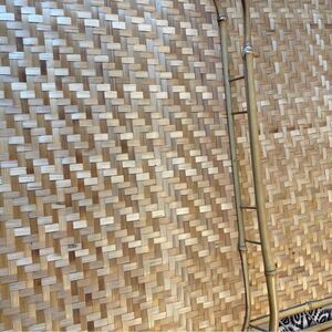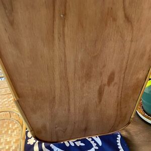 6 rattan trays. From a clean home! They could use a wipe down I’m not sure how to clean them! Broken slats in some areas. They are intact. Good shape but not new shape. Not perfect! Bought at an estate sale to use for my daughter’s bridal shower years ago to help display snacks. One tray has a discoloration. Pictured! The table cloth is beautiful and reversible. 38x72. Trays are 13x18. I would still use them again if any more of my kids wanted that type of decor for something!