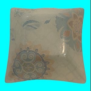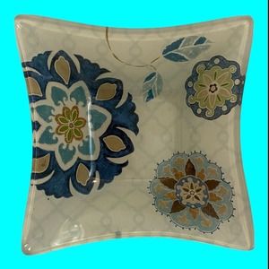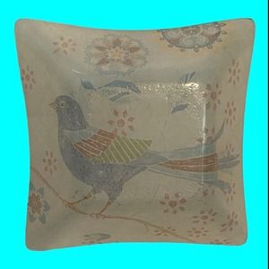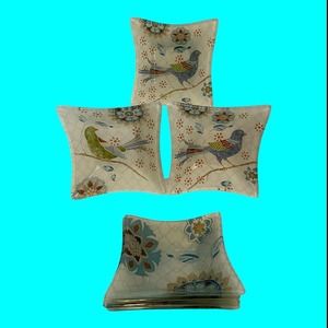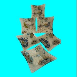 Set of 6 Reverse Painted Glass Snack Bowls. Three are decorated with Abstract Birds and the others are a Mosaic decoration. The design is midcentury modern. They measure 5" square. Unusual and unique. I have one extra bowl that I'm sending with the other 6.
