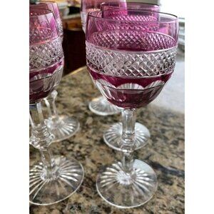 This six-piece set of St. Louis Trianon amethyst purple hock wine glasses is a stunning addition to any collection. The glasses are hand-blown and feature a cut crystal design with a glossy finish. The TRIANON pattern is beautifully detailed and the glasses are signed by St. Louis. The glasses are 7 1/8" tall and have a round shape. They are unisex and perfect for any occasion. The glasses are handmade and require hand wash only care. The set is an original vintage piece from the 1900-1919 era and is an exquisite example of Victorian style. The glasses are in excellent condition and are perfect for any collector or enthusiast of fine crystal glassware.