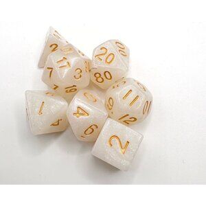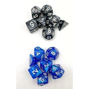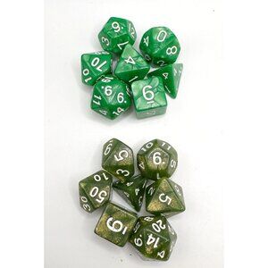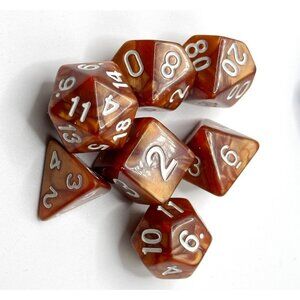 The product is 6 sets of solid color pearl pattern polyhedral dice designed for use in tabletop role-playing games like Dungeons & Dragons. These dice are multicolored, adding a decorative element to game play. Perfect for collectors or players looking to enhance their gaming experience with unique and visually appealing dice. Ideal for adding variety and excitement to gameplay in CCGs and TRPGs. Each set comes in a black velvet bag. In excellent condition.