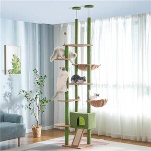 🧿Space Saving and Ajustable Height: This floor-to-ceiling cat tree with a bottom base measuring 15.7x17.7” that occupying minimum space while providing maximum vertical space. It is constructed with different height of post to allow it to accommodate the ceiling height between 81.8-108”【208 to 275cm】It has a modern tone of Green Cactus, Beige, and Grey to blend any decor of your house.