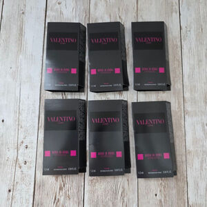 This is a set of six Valentino Born in Roma Donna sample vials. Each vial contains 1.2 ml / 0.04 FL.OZ of fragrance. The vials are housed in black cardboard boxes with pink accents, displaying the brand and fragrance name. The boxes are in new condition, but without original tags or packaging. The back of the boxes lists ingredients and other product information. The vials are designed for spray application.