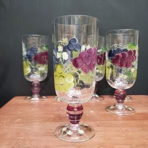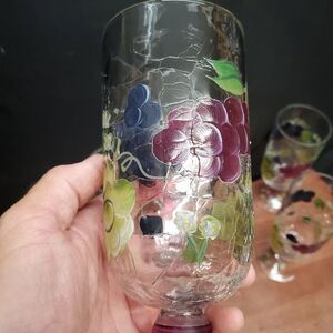 6 Vintage 1990's Crackled Glass Hand Painted Grapes Water or Iced Teas Glasses