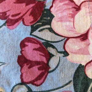 Set of 6 handmade vintage cloth napkins featuring large, eye-catching pink and red flowers complemented by clusters of smaller, cheerful yellow flowers. Lush green leaves and stems weave throughout, adding depth and detail. The overall design evokes a sense of joy, liveliness, and vintage charm.
