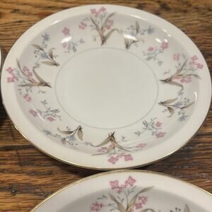Six beautiful rimmed soup/cereal bowls with dainty, delicate floral pattern, and gold trim. From.Meito China, Japan, this is the discontinued, “Lucille“ pattern, which I believe was made in the 1960s. Please zoom in, each bowl was photographed individually for your careful inspection. There are no chips or cracks, these are gorgeous and would set a beautiful table! We have two sets available for a total of 12, if you want a complete service for 12, please take advantage of our terrific volume discount. 7.5 inches in diameter, this pattern is lovely, and would complement many others.