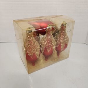 6 Vintage Red Satin Glass Teardrop Gold Glitter Christmas Ornaments