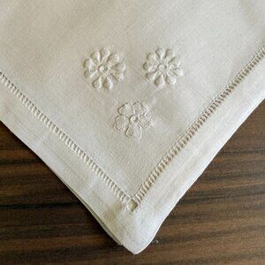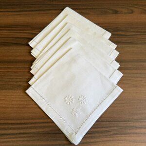 6 Vintage White Linen Napkins 12"x12" Reticulated Edges & Floral Embroidery