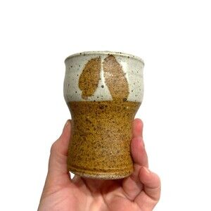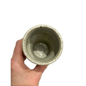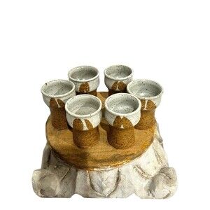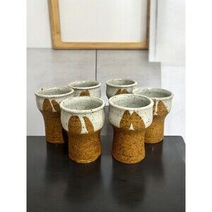 The product is a set of 6 vintage small studio art pottery salt glazed goblet vases cups. These unmarked vases are beige in color and feature an arts and crafts/mission style design. Made of stoneware using pottery production techniques, they showcase a decorative salt glaze finish. Perfect for adding a touch of artistry to any space, these vases are a unique and stylish addition to any collection of decorative pottery and glassware.