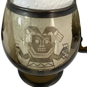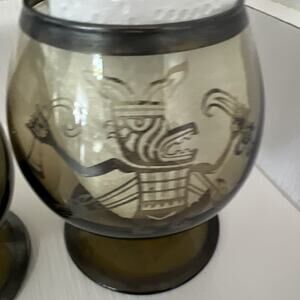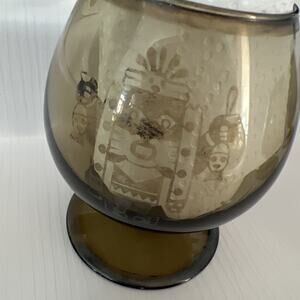Elevate your home bar with this set of six vintage smoked glass snifters! Perfect for brandy, scotch, or cognac, these glasses add a touch of sophistication to any occasion. The unique Mayan design gives them a distinctive, worldly charm. Made in Peru, they are a unique find for collectors and anyone who enjoys fine spirits.