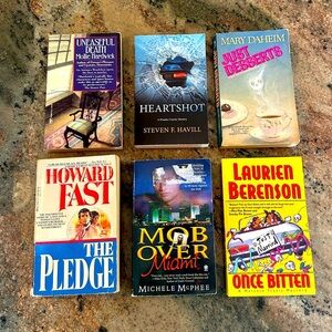Collection of six mystery and crime novels with colorful covers. Perfect for book lovers.