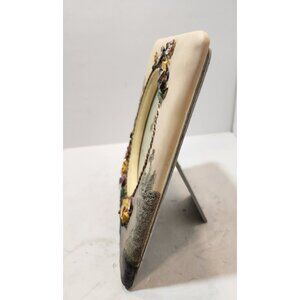 This hand-painted floral pansies 3D picture frame features a rectangle shape with an oval cutout, perfect for displaying a single photo in portrait orientation. Made of ceramic in multicolor, this original decorative collectible is ideal for all occasions. The intricate floral theme adds a touch of nature to any room, making it a beautiful addition to adult's living spaces. The frame is free-standing and measures 6" by 8", making it a unique and charming piece for any home. Pre-owned by collector. In good condition. Please see pictures for details.
