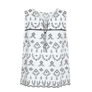 Talbots Petite sleeveless embroidered top in size SP. Crafted from a breathable 55% linen and 45% cotton blend with 100% cotton embroidery. Features black floral and geometric embroidery on white fabric, a tie neckline, and scalloped hem. Lightweight and perfect for warm weather or layering. Machine wash cold, gentle cycle; tumble dry low, warm iron if needed. Made in India. Classic Talbots quality with a relaxed, polished look—ideal for casual days or resort wear. Runs true to size for petites; see photos for details and care tag.