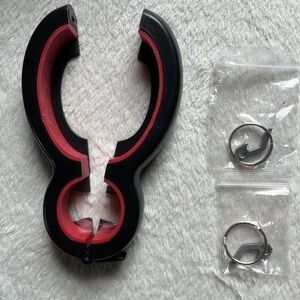 This black and red portable handheld can opener is a versatile kitchen tool that helps you effortlessly pull rings and remove can lids. It's a must-have for any kitchen!
