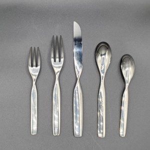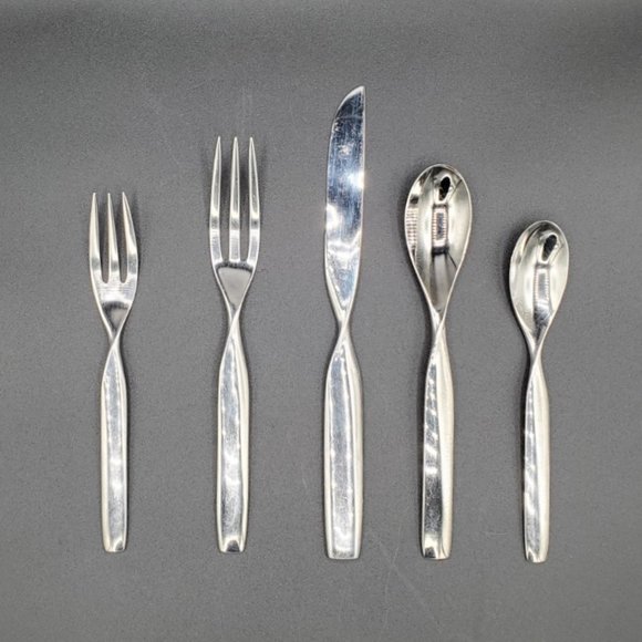 6 x Vintage Sasaki Double Helix by Ward Bennett set of 5 piece place setting. This set looks elegant and feels luxurious. They are a timeless style for special occasions or to make every meal special. This was my personal (6) 5 piece place settings that had been gently handled and with care. Replacements sells for $230.00 each. Fork 7 7/8", Knife 9 1/8", Salad 6.75", Soup 7.5", Teaspoon 6.5".