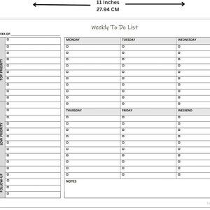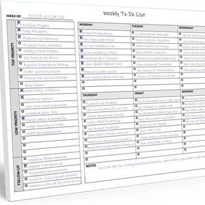 60 Page Weekly To Do List Planner Notepad. Weekly sheet to-do list notepad that house a checklist, a top priority, a low priority, and a follow-up section, along with sections to make notes or appointments on Monday through Sunday. 60 page writing pad. The perfect size, at 11 X 8.5 inch A4 notepad, landscape horizontal layout. Quality 100 GSM smooth white paper with chipboard backing.