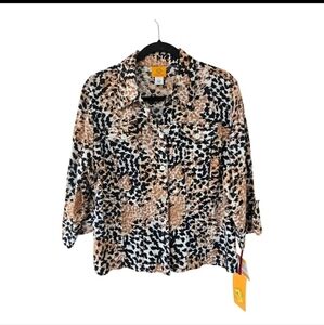 Stylish leopard print button-up blouse. Features a mix of black, tan, and cream colors. Perfect for casual or formal wear.