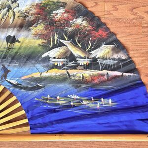60 x 35 VTG Large Asian Fan Hanging Wall Décor HandPainted Village Mountain Lake