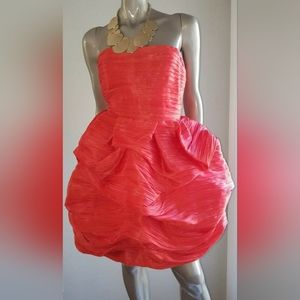 $6,000 OSCAR DE LA RENTA STUNNING SILK CORAL RED ROSE PLEADED RUNWAY DRESS 6, 8.