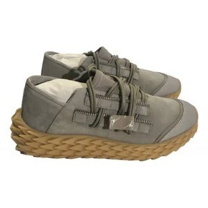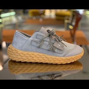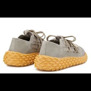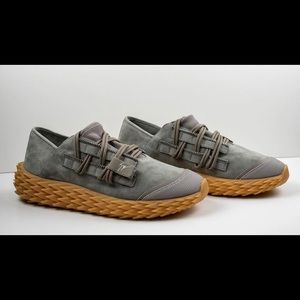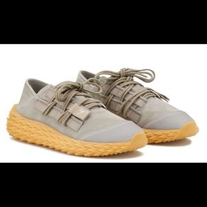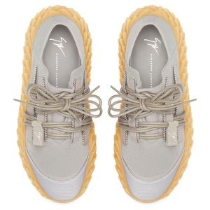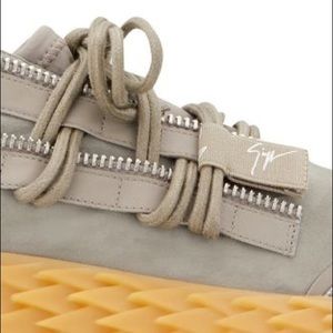 Grey lace-up sneakers from Giuseppe Zanotti. Made of smooth suede with tech fabric toe cap. Decorated with sewn-on zippers and logo tag. Yellow textured rubber sole. Made in Italy. ⭐️New & Authentic in original box with dustbag