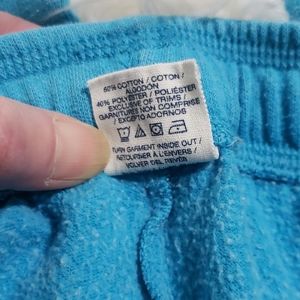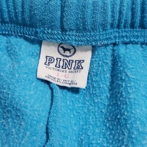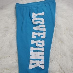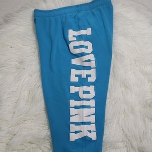 Cute pair of blue jogger style sweatpants by Victoria's Secret PINK. Women's size Large. Blue with white LOVE PINK on leg. Interior drawstring waistband. Normal wear, no rips stains or signs of excessive wear.