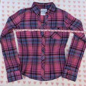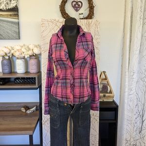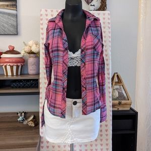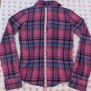 Super cute hot pink flannel. This flannel is lightweight and thin. Perfect cover up over tank tops on hot days. The sleeves have a strap to secure it into a 3/4 sleeve style.